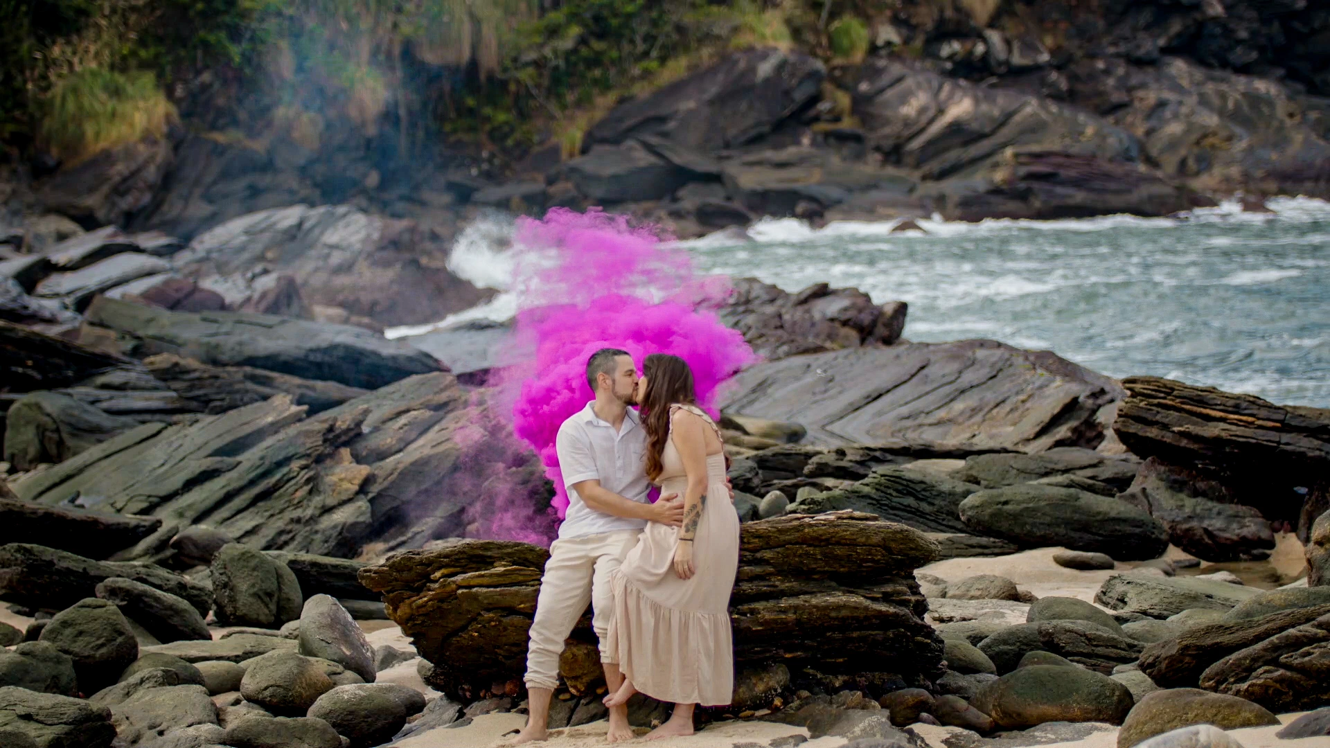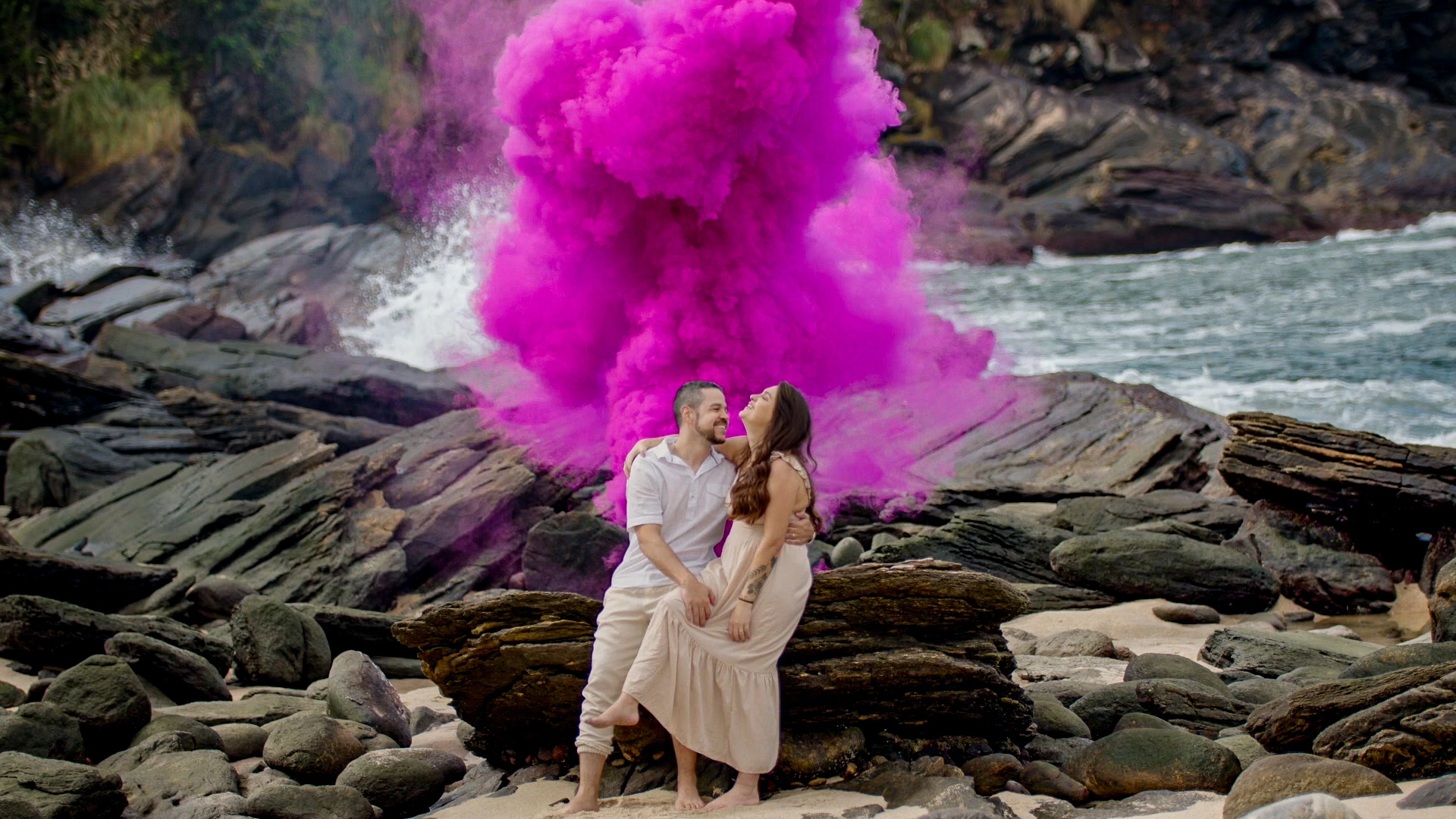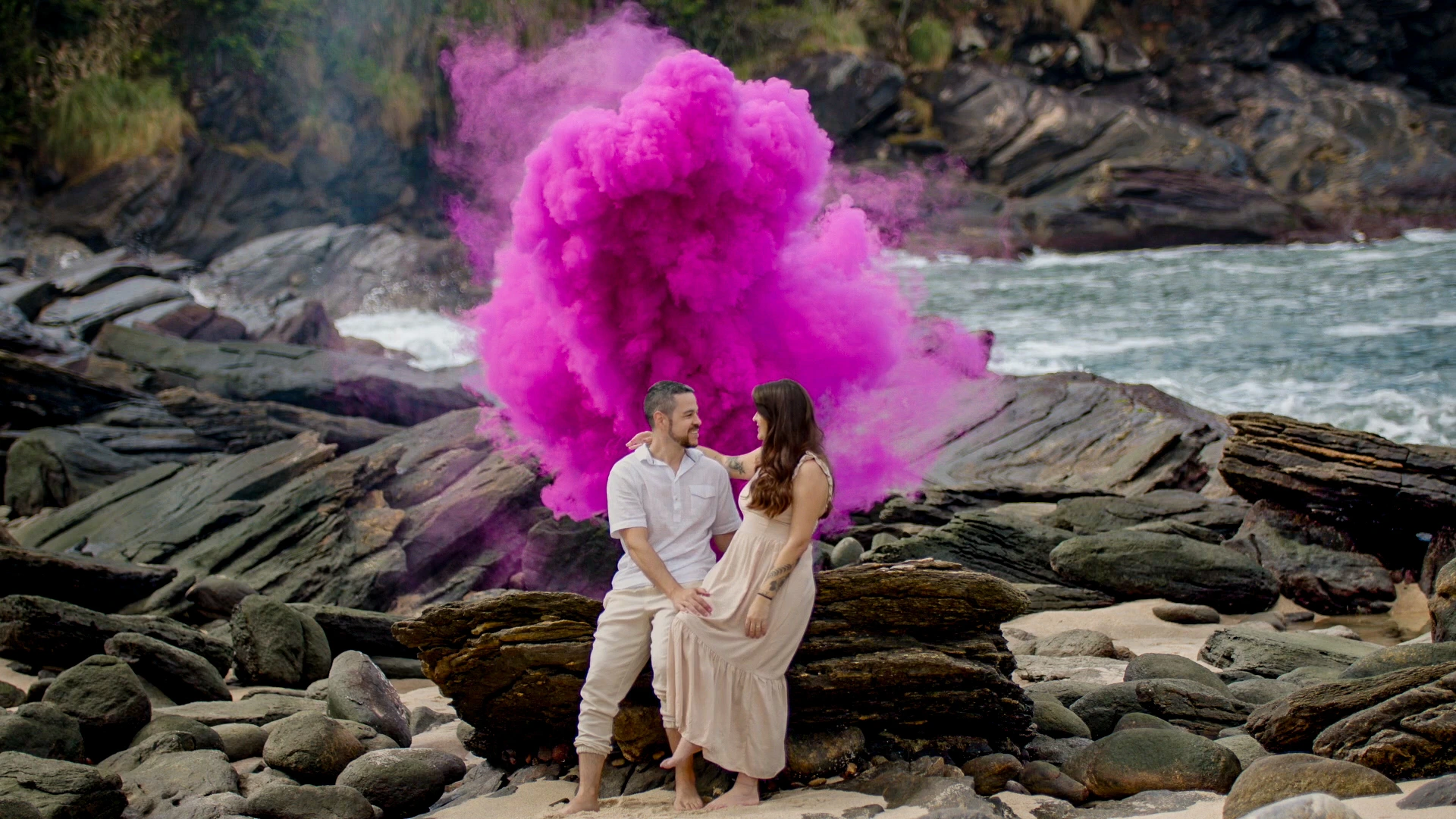 Nas paisagens deslumbrantes da Praia de Calhetas, no litoral norte de São Paulo, produzimos um filme de revelação com linguagem cinematográfica para eternizar o momento de Giovanna e André. Com narrativa sensível, trilha sonora envolvente e composição de enquadramentos que valorizam a conexão do casal, o ponto alto do filme é a explosão de fumaça rosa revelando a chegada de uma menina. Cenas em movimento, detalhes captados com delicadeza e imagens aéreas com drone compõem um filme emocionante, feito para ser lembrado como um verdadeiro capítulo de cinema na história da família.